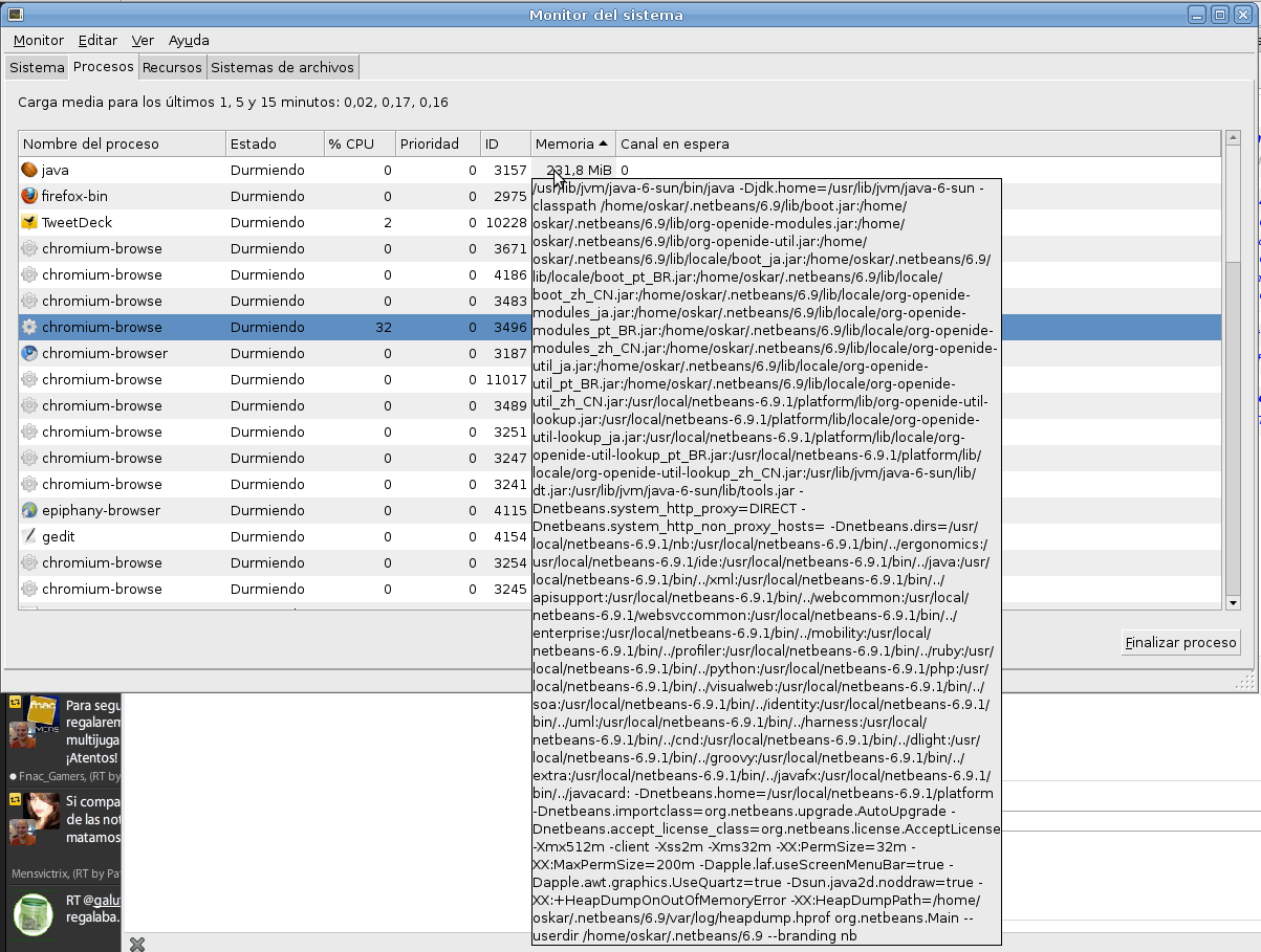 En la imagen se puede ver como java se zampa más e 200 megas de lo lindo de recursos de mi sistema,y únicamente tiene levantado netbeans :)