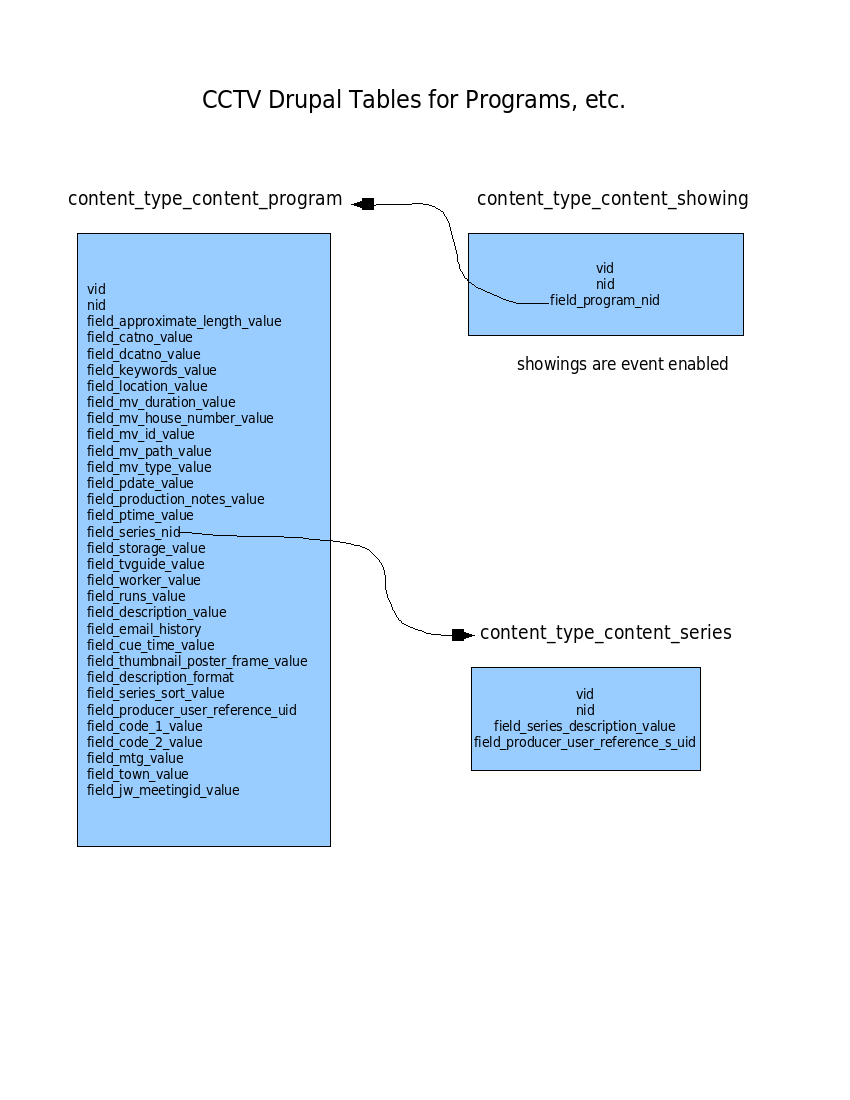 CCTV project/episode/showing structure is a bit different from the draft. Our main focus is on the Program. Series and Showings are very slim. A program can have zero or one associated series and zero, one or many associated showings. The diagram below shows the main CCTV program scheduling tables. There is some vestigal cruft in the program fields (last 5 fields). The five fields that start with field_mv refer to the MaestroVision playback system. These are the minimum info needed to export a playlist to MV.
