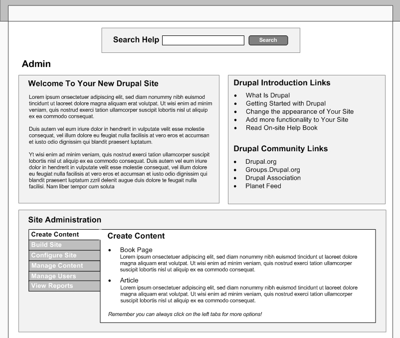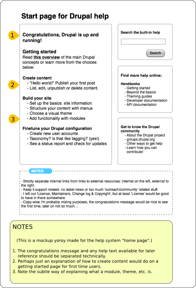 There is a lot of overlap between the welcome page and the help system. Gurpartap Singh created a new help system for D7, based on the advanced_help module by merlin. This help system needs its own "home page" (the page living at www.example.com/help or whatever the path will be). yoroy made a mockup to aid in that discussion. Here is the mockup, with my own notes attached: