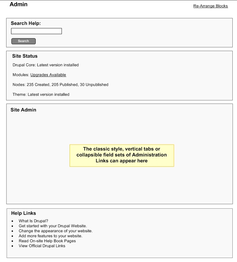 Is faceted search going to be available in a core release? The search block in the mock up assumes that faceted search would be in core in Drupal 7 and it can be used to search out only help book pages under a pre-built help book that only super admins can edit by default. If faceted search and a book based help system is out of the question, the search block can directly search d.o with the results displayed in a modal dialog or separate browser window so that users are aware they are viewing the results from a separate website. The search block and help links on /admin are not meant to replace Advanced help since I assume advanced help is available to non-site administrators while /admin usually isn't.