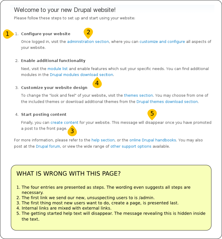 * The same applies here as to the last point. We are again guessing what the user would like to do next and sending them off to random parts of the site and to drupal.org to go download more themes. Why put that link there? A link to the contributed themes is mentioned on that actual themes page, so putting it here too is just confusing. It's another example of the numbered list appearing to be simple but it doesn't actually make any sense that anyone would build a site like that. Just because new user's cling to this list, doesn't make it a good thing.