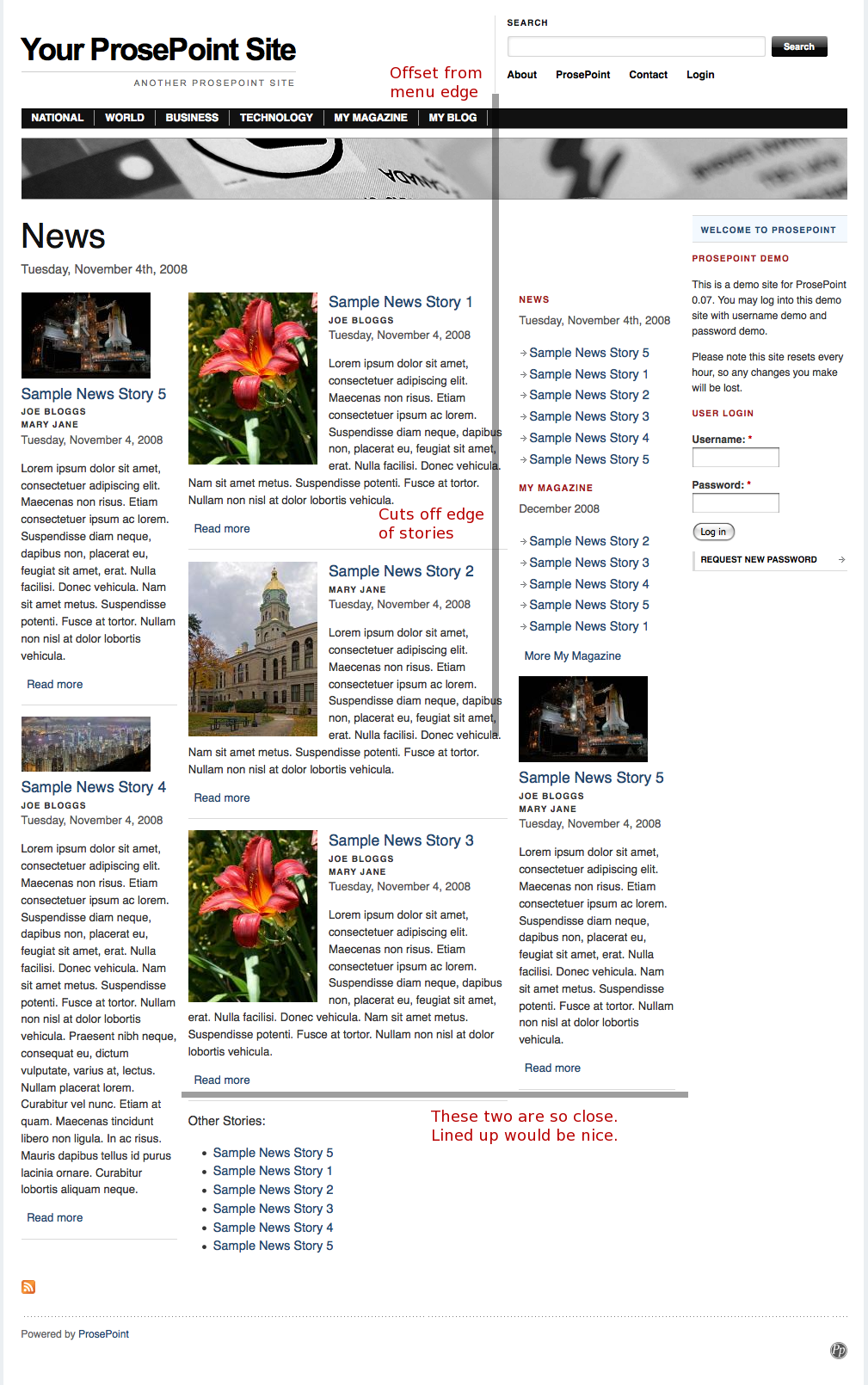 "This is an interesting idea. I noticed that in the layout structure of the demo the different elements on the page do not line up. For example, the vertical line on the left of the search bar is not visually continued in the columns further down the page. The horizontal separation between stories in the columns of the body do not continue to the left or right across any other columns. This is especially noticeable at the bottom of the 2nd and 3rd columns where the grey lines are only a few vertical pixels apart from each other. See the attached document where I've highlighted some of these problems."