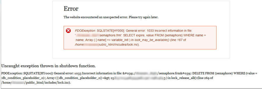 There have been periodic problems with a Drupal 7 multisite installation with this one hosting company. What happens is when the site is visited an error code, like the one attached, appears. It affects the primary site as well as all of the multisites. The only way to fix it s to re-install Drupal's core, then all of the sites return to normal.