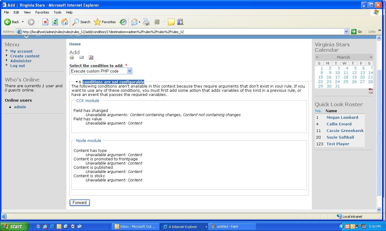 Noob here. I am attempting to add Breadcrumbs to panel pages in a more simplistic environement than what was discussed in http://drupal.org/node/363818 using Triggered Rules. I have a CCK Content Type named roster that gets displayed using the Panel module. I followed your discussion in the reference link and attempted to Set Breadcrumbs on the Content Type = Roster. I selected for the Event --> System --> "User is going to view a page". When I got to the page to "Select the condition to add:" I was unable to choose Content has type = roster. The condition I was looking to add was in the "conditions are not configurable" section (see attached screen image). Any ideas on what I did wrong, need to do, add, code (I'm not a PHP coder by the biggest imagination)?