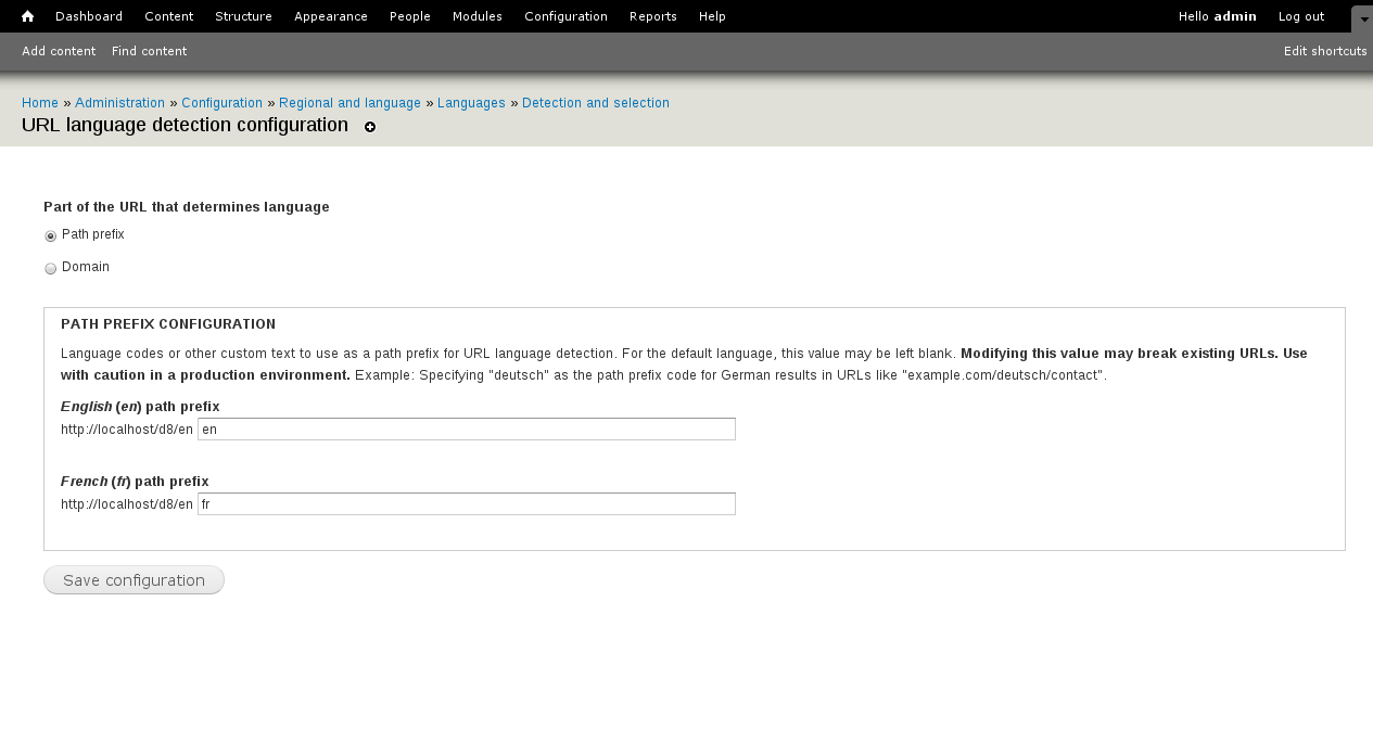Talking with one person in IRC We found a strange behavior in configure prefix language (In drupal 8). For example: you have two language (english and french) and active url detection. You configure a prefix for english => en and french => fr. If you access with language english and access to admin/config/regional/language/configure/url. ¿Is normal that reappears the prefix?.