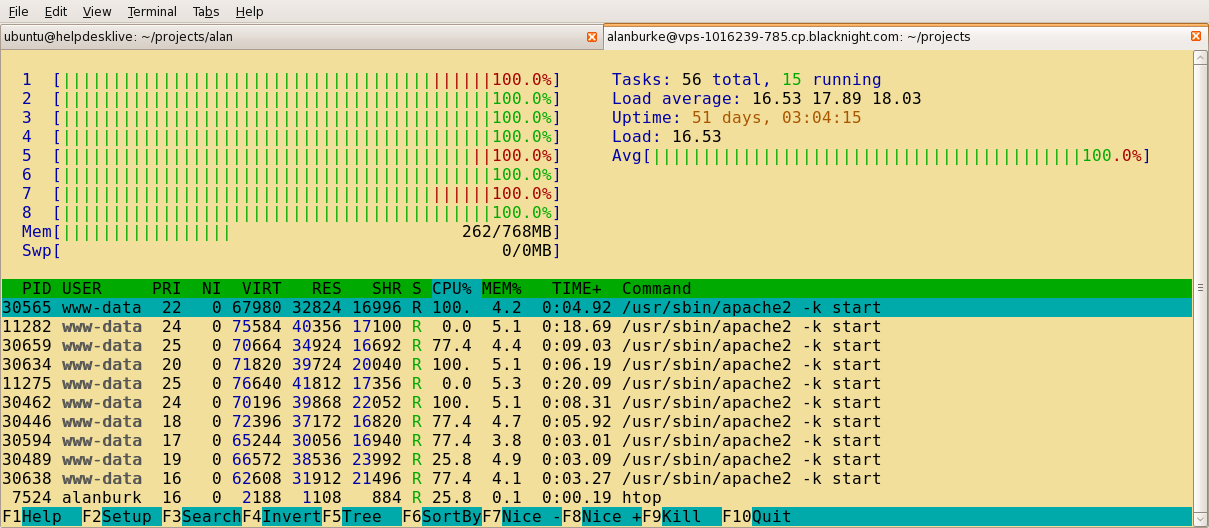 Many Apache processes seem to be running at 100%.