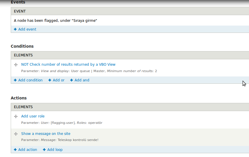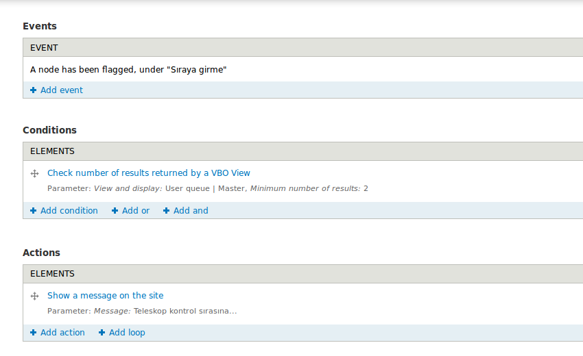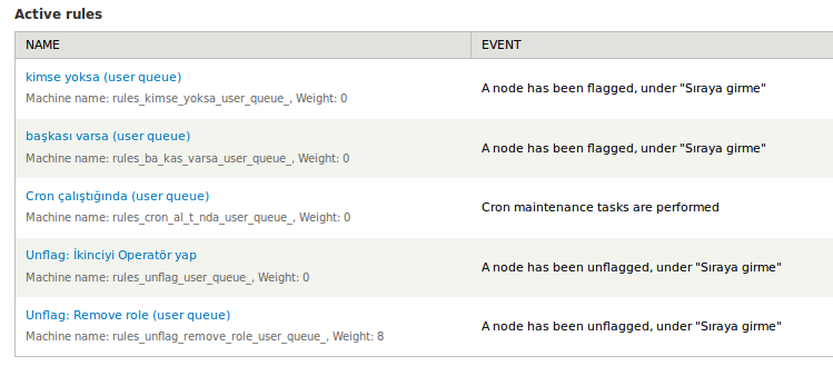 6- Rules ile flag, unflag ve cron çalışması durumları için algoritmalar oluşturdum, hepsini ekte resim dosyası olarak yükledim. (Ufak bir ayrıntı; bir schedule oluşturdum, cron dakikada bir sırayı ilerletmesin de, bir dakika sonraya iş olarak yazsın. Böylece birisi tam kontrolü yeni cron çalışırsa kontrol anında elinden gitmeyecek)