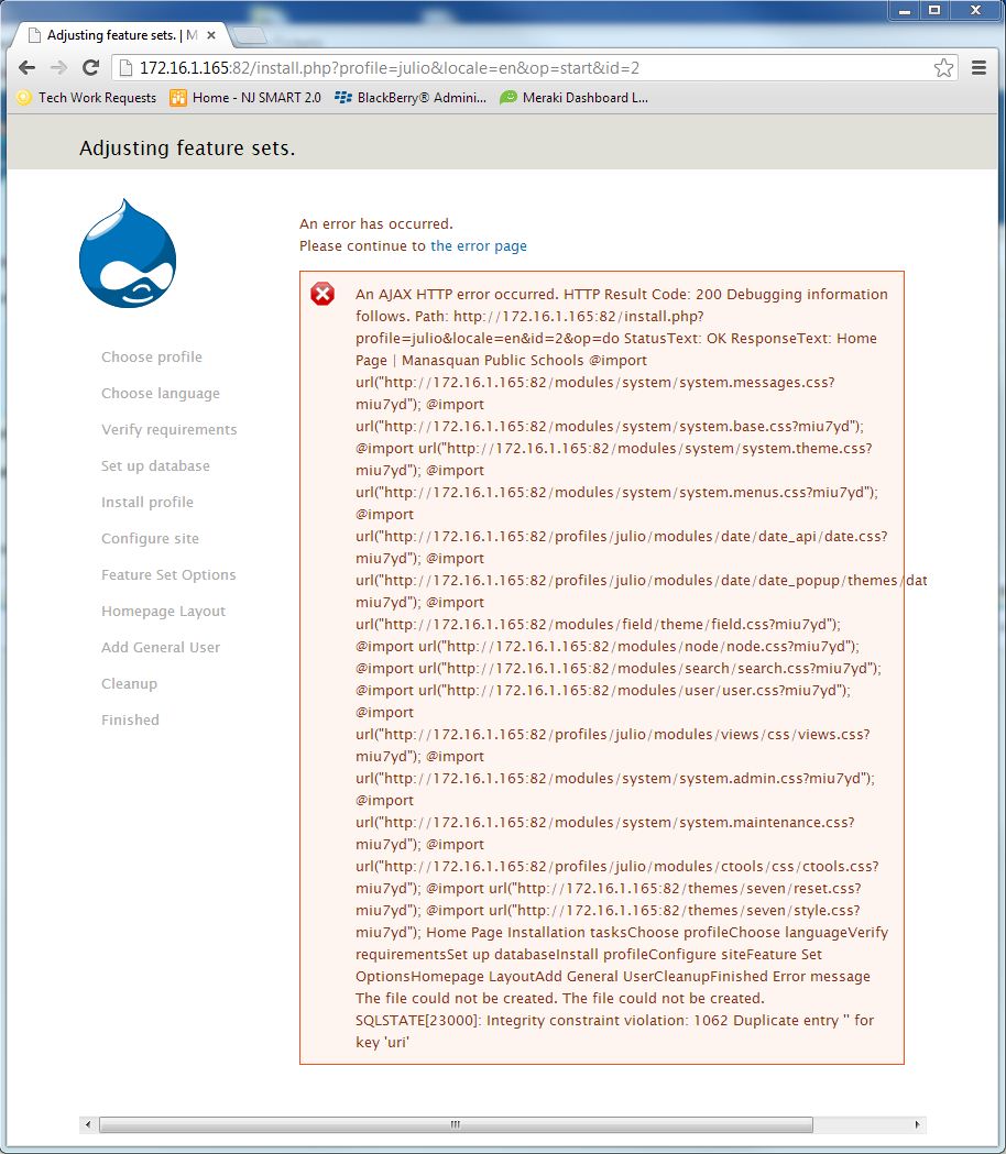 During installation during the Adjusting feature set phase a full page of errors comes up that I am not sure how to interpret. When I click continue to the error page the installation continues but then the site does not function - looks like no css files load among other problems. Any idea what is causing this? I've done two clean installs now and the same problem.