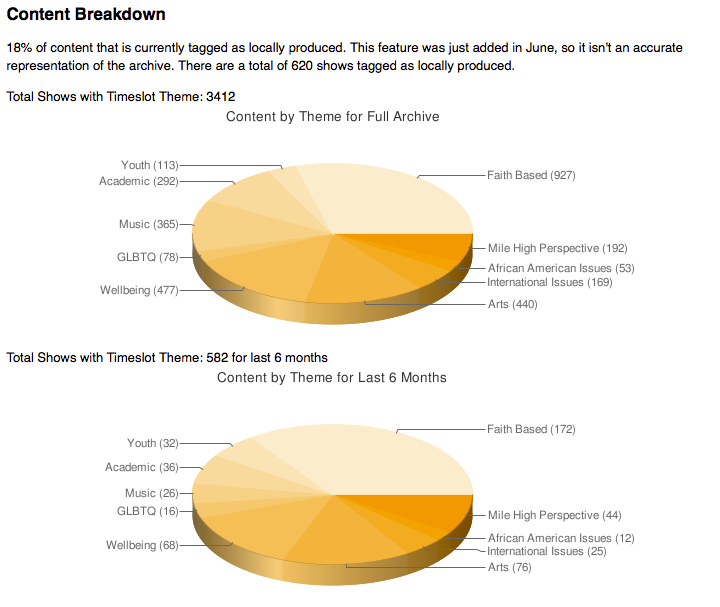 Ann is actually considering or decided to combine African American and Latino into a more general Cultural Theme. This is in large part because we just haven't gotten enough content schedule the number of hours given to those themes. I've added the code I've used on Denver Open Media's stats page to the dev versions of om_support and om_timeslot_scheduler. For theme based autoscheduling to work as designed, there needs to be some relation between the amount of content in a Theme and the number of hours given to that theme.