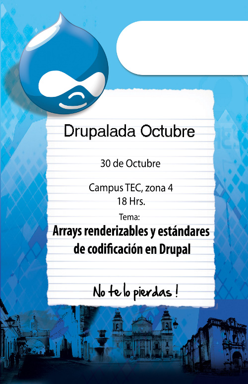 Para continuar con el aprendizaje, están todos invitados a la próxima Drupalada que se estara realizando este 30 de octubre, la cual Tratara sobre Arrays renderizables y estándares de codificación en Drupal, impartida por Walter Herrera