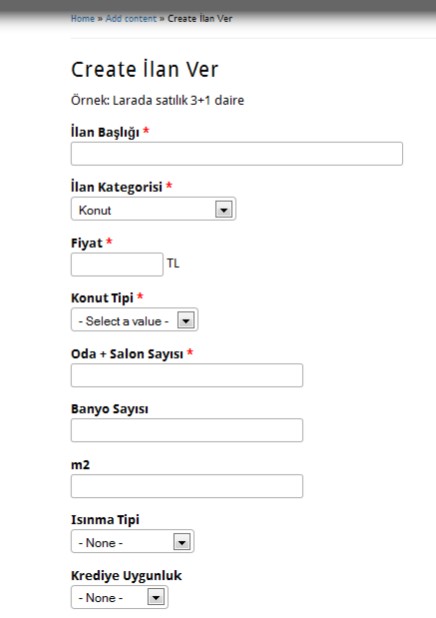 Site yapmaya ve drupale yeni başladım. Resimde görüldüğü gibi emlak sitesi için bir içerik türü oluşturudum.