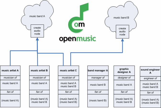 I've been striving to work out the best approach but I am always at dead ends. Organic groups, buddylist, taxonomy access, a more granular form of access control, somebodysysop's og_user_roles, which of all!? How can a user be a fan of Band A and simultaneously be Band A's manager. From what I've gathered so far, organic groups seems to be the best approach, where a generic og member is a fan, and roles specific to each group tell what kind of a fan one is. A band's manager should be given the right to publish an event node to the band's og page, a band's graphic designer to publish an image node, much like a music artist should be able to create an audio node in his bands og page.
