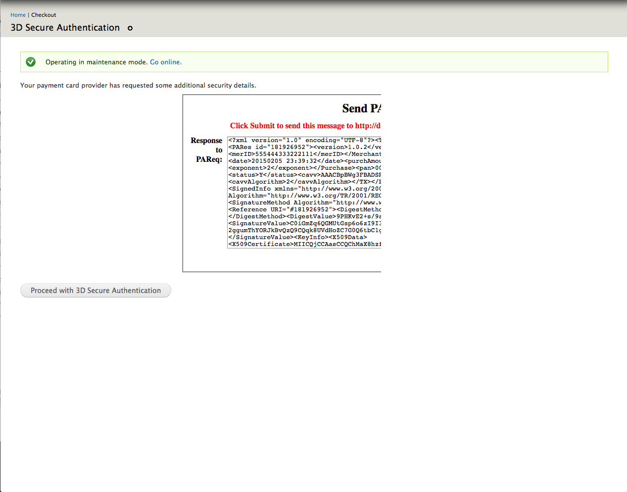 I've been testing the 3D Secure with the test credit card numbers supplied by Realex. All transaction types processed correctly except for the card type which isn't registered for 3D Secure. While this transaction correctly goes through the ECI on Realex's backend for this transaction is '1' whereas it should be '6' (as the test cards are all VISA numbers - 1 is for Mastercard). I have no idea where this number is coming from but the guy I'm dealing with in Realex has asked me to see if it is a Drupal issue before he checks it at his end as he has no record of there being an issue.