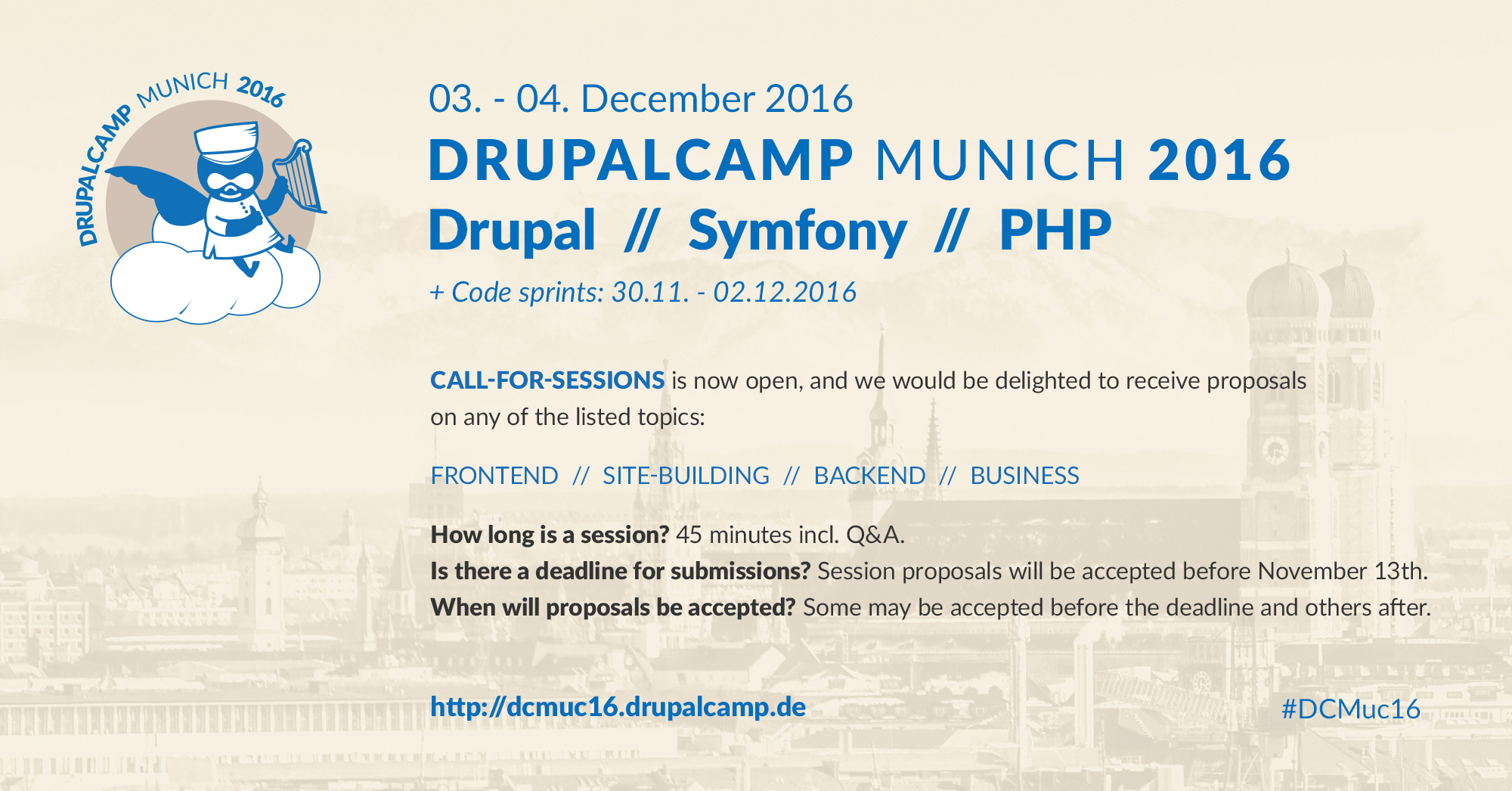 Back in 2010 the Drupal Munich team hosted the very first Drupal DevDays. After a gap of 6 years, we have decided it's time for us to host another event, and we are excited to invite you to DrupalCamp Munich 2016.