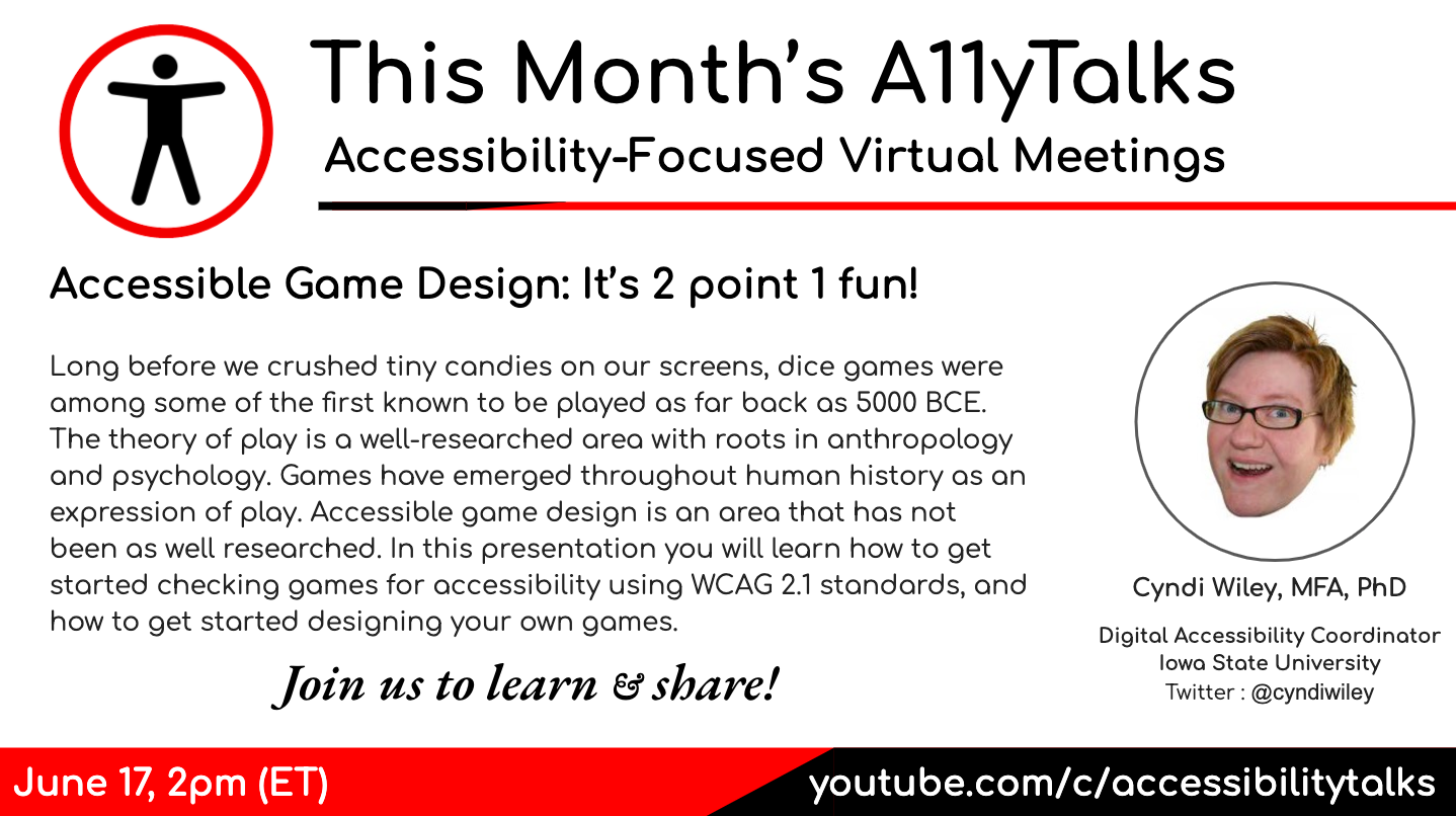 Join Cyndi Wiley, MFA, PhD, Digital Accessibility Coordinator at Iowa State University for June's addition of A11yTalks.
