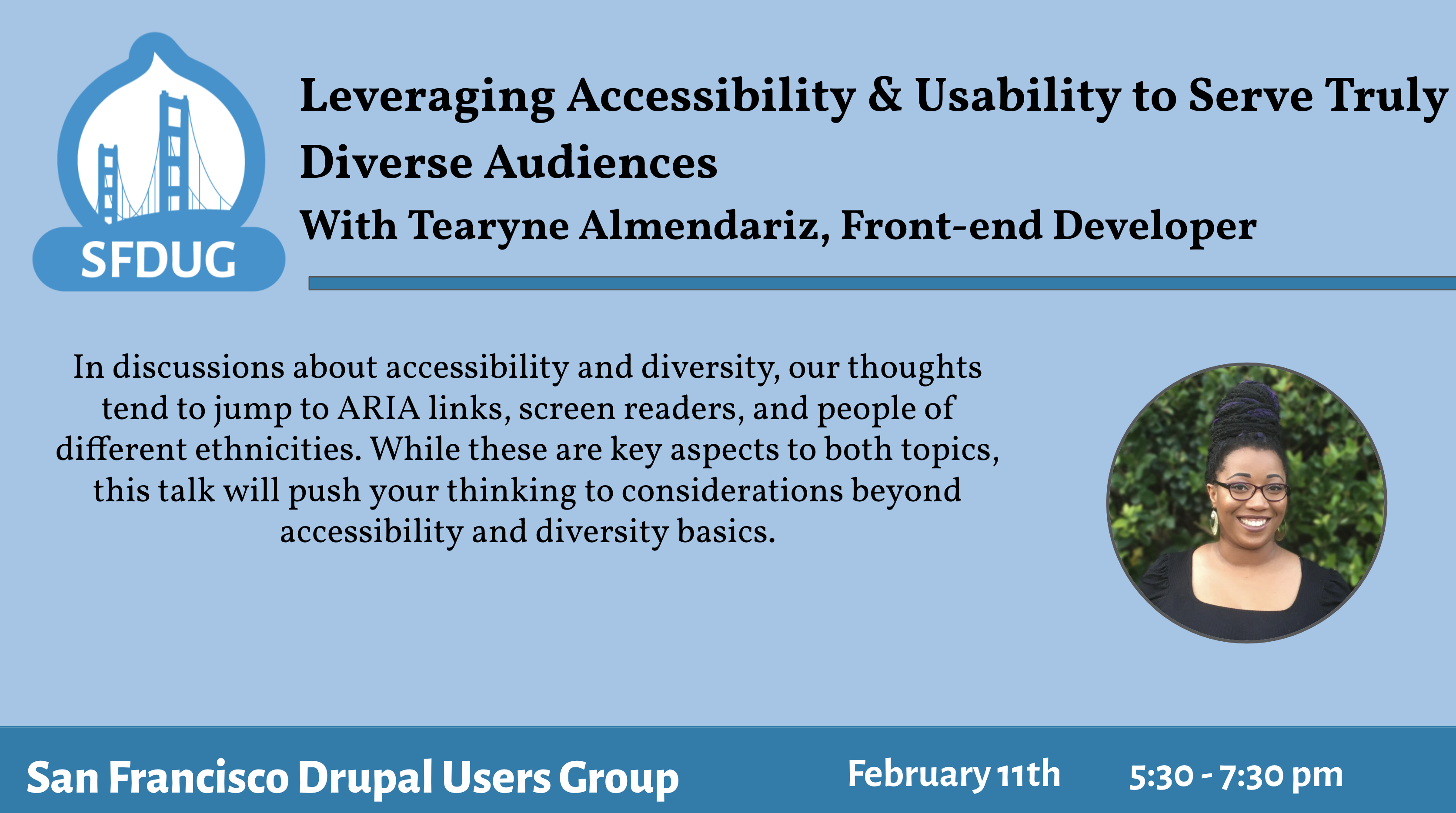 Tearyne D. Almendariz is a Technical Project Manager and Frontend Developer at Bright Plum. She is a Certified Professional in Accessibility Core Competencies with the International Association of Accessibility Professionals. She lives in Dallas, TX, USA. In addition to her professional duties, she currently serves as the Careers Lead for the Drupal Diversity and Inclusion (DDI) Initiative.