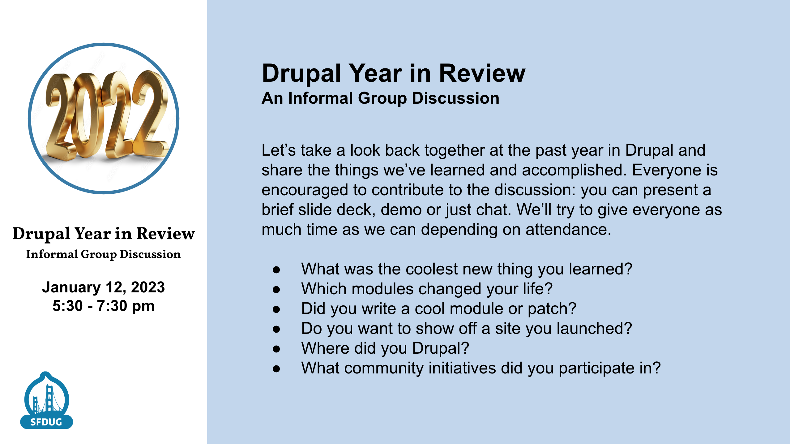 Let’s take a look back together at the past year in Drupal and share the things we’ve learned and accomplished. Everyone is encouraged to contribute to the discussion: you can present a brief slide deck, demo or just chat. We’ll try to give everyone as much time as we can depending on attendance.