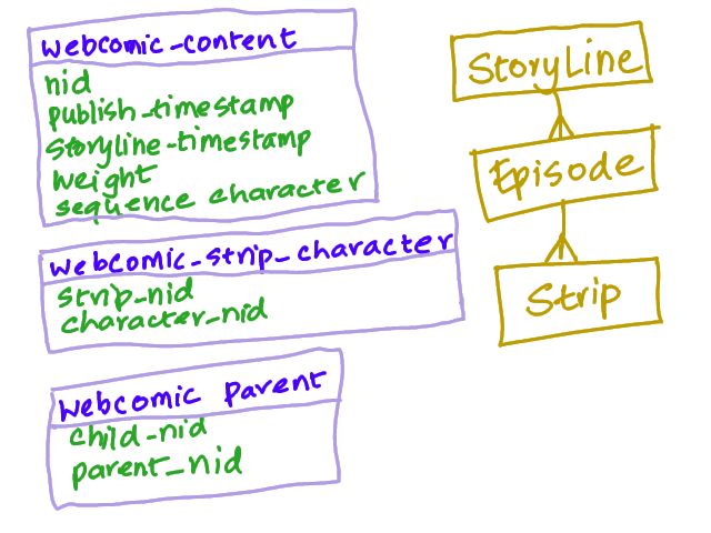 The data structure that sits on this schema is something like this: Storyline > Episode > Strip
