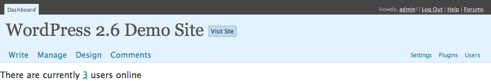 In particular, notice the use of multiple navigation regions in wordpress 2.5. I believe there were 5 navigation regions in the header alone. I think this layout is more effective, for personal publishing, than our current dense layout which targets site developers.