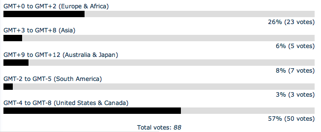 The International Time Zone poll was a huge success. We've seen that there is an fair amount of interest in the dojo from timezones across the world. It's too bad the Advanced Poll got messed up, but I saved a screenie of it. The original poll is now closed, and here are the results: